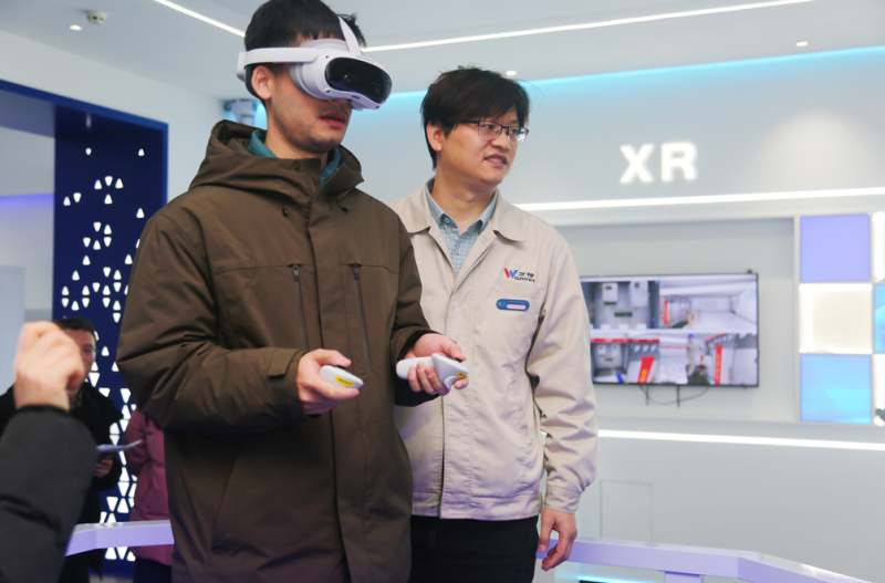 交流期间,来访嘉宾首先走进万特电气产品展厅,近距离观摩公司前沿的电力仿真培训设备,并沉浸式体验高空坠落体感装置、电力安全VR体感装置、人体触电体感设备、电弧灼伤体感设备等系列互动产品,对万特电气将VR/AR/XR 等数字技术与电力培训深度融合的创新模式予以高度认可。