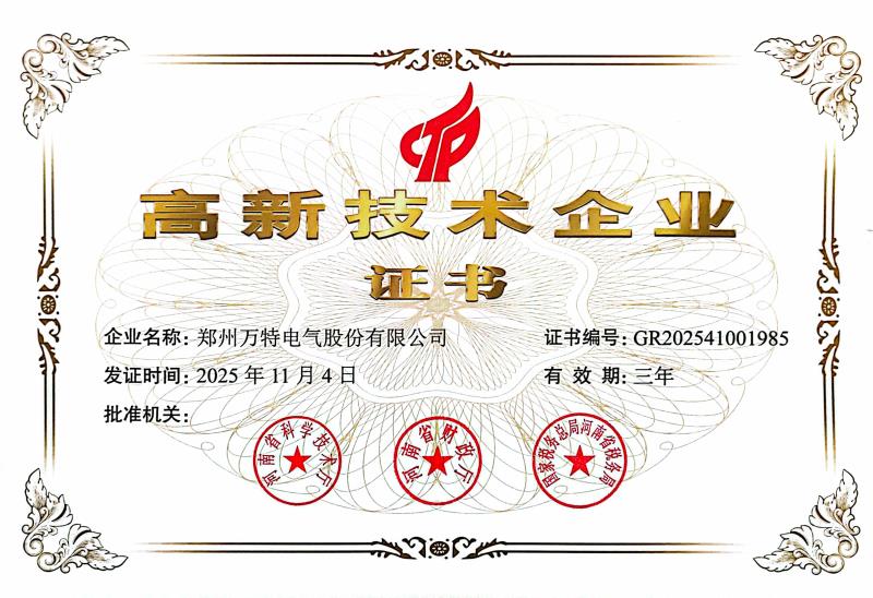 近日,万特电气传来重磅喜讯!根据《关于组织开展2025年度高新技术企业申报工作的通知》(豫高企〔2025〕1 号)文件规定,河南省2025年第一批3160家拟认定高新技术企业名单完成公示及核定,万特电气凭借出众的科研创新能力、精细化的产品制造能力和稳定的品质把控能力,继2022年再次通过 “高新技术企业” 这一重量级荣誉资质认证,相关认定证书已正式下发,有效期三年。