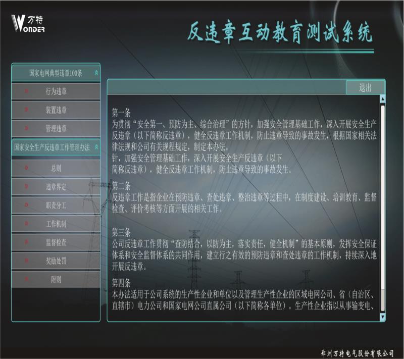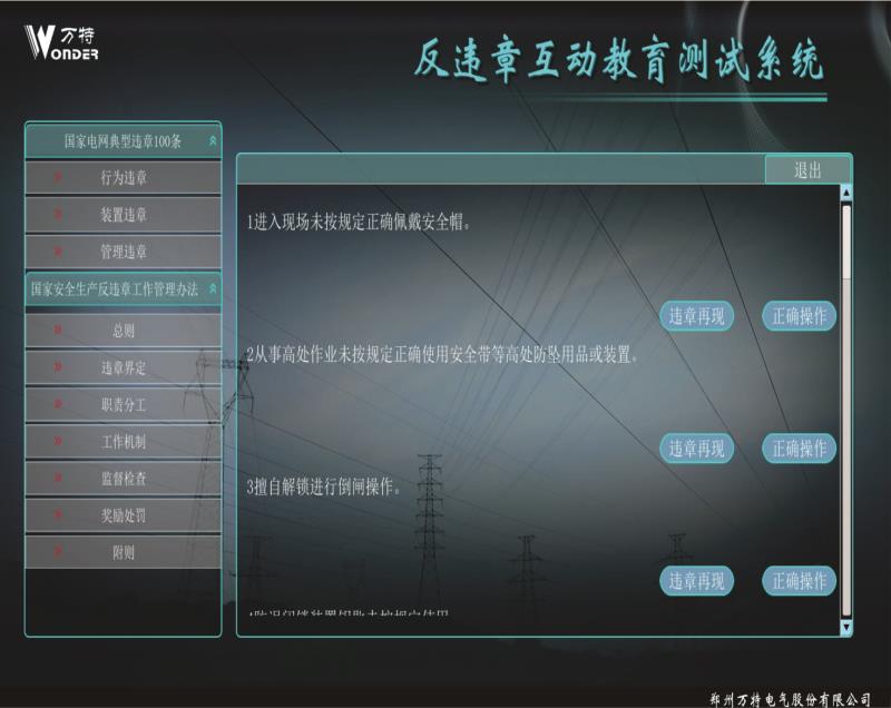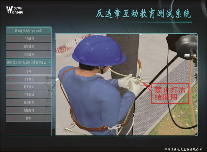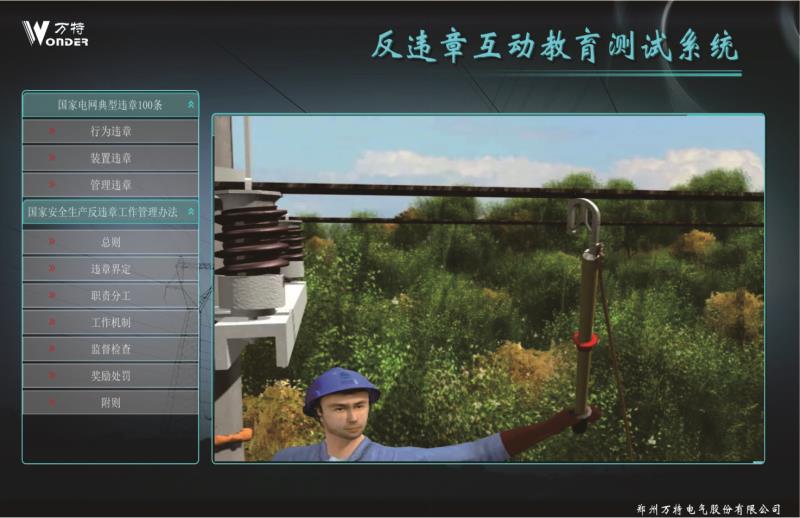 反违章互动测试系统设计案例依据国家电网公司编写的 《国家电网公司安全生产违章100条》,进行编制相关 事故,遵循《国家电网公司电力安全工作规程》进行正 确动画的制作。反违章互动测试系统运用三维动画等先 进开发技术逼真还原事故过程、事故现场,突破了传统 安全教育不能用视频重现事故过程的缺点。更真实的展 现违章作业过程,更直观的感受到违章作业后果,更深 刻的理解遵章作业的重要意义。